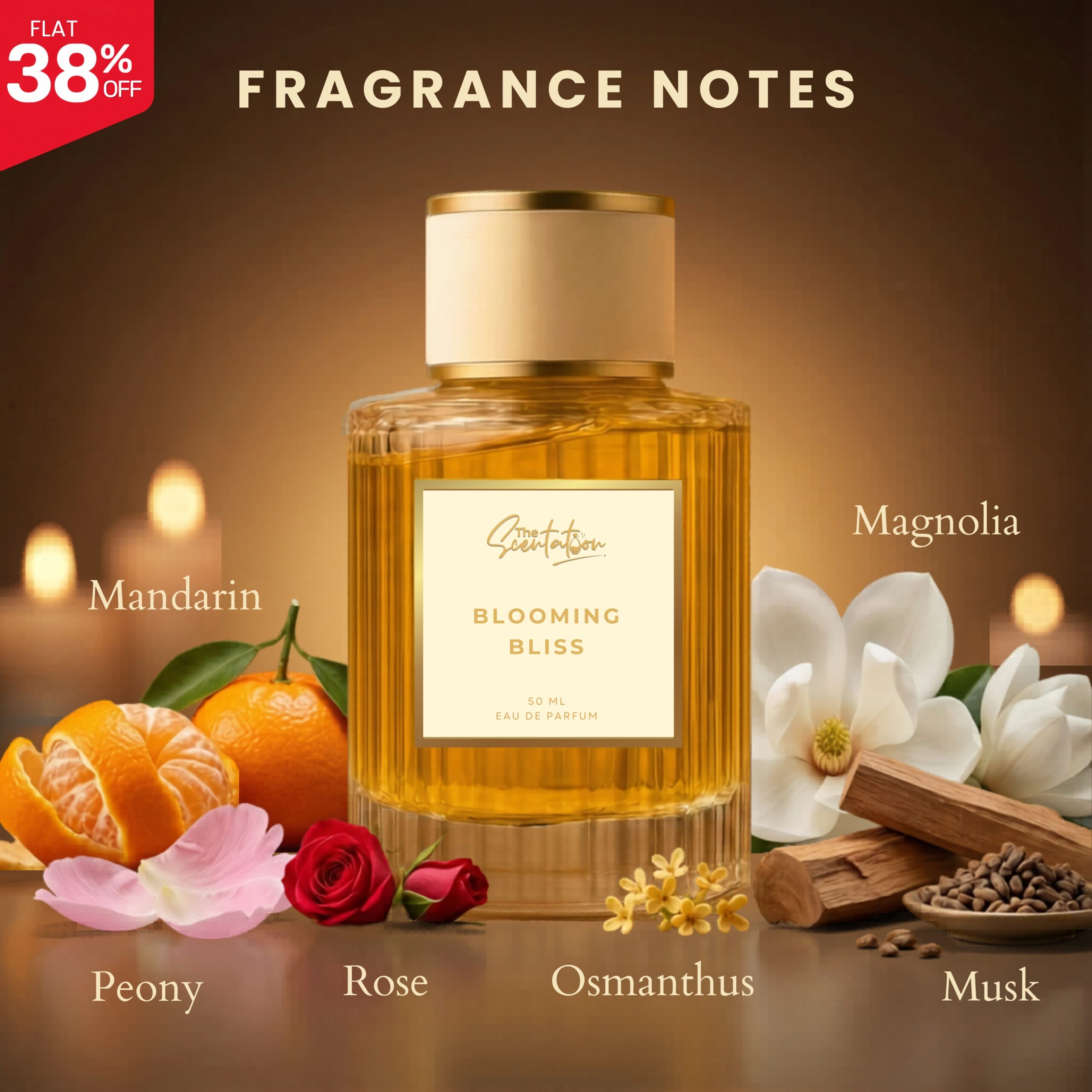 It opens with a lively burst of citrus and peony, instantly bright and uplifting with a touch of youthful charm. The heart blossoms into a delicate bouquet of rose and osmanthus, adding depth, femininity, and romantic allure. As it settles, warm sandalwood and creamy vanilla create a soft, comforting base that lingers beautifully — leaving behind a trail that is fresh, floral, and irresistibly blissful.